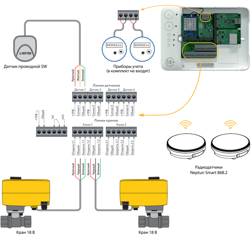 Новинка 2025: Улучшенная версия, при обнаружении протечки краны перекрывают воду в 2 раза быстрее по сравнению с другими системами Neptun. Компоненты системы работают через модуль управления Neptun Smart+ 18, который может быть укомплектован дополнительными платами расширения: