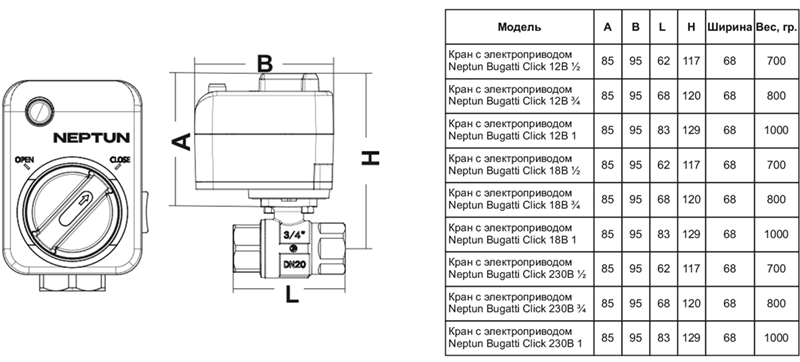 Шаровой кран с электроприводом Neptun Bugatti Click 12В 1/2"