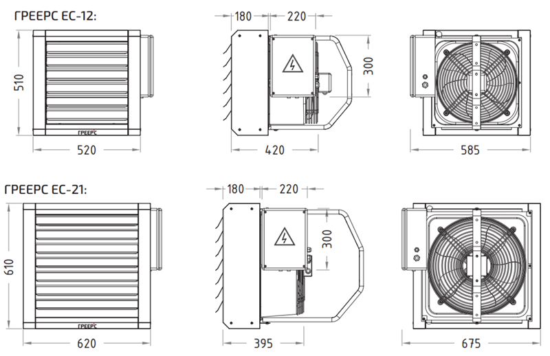 Монтировать электрические тепловентиляторы ГРЕЕРС ЕС можно только на стене в вертикальном положении. Регулировка потока воздуха осуществляется в том числе благодаря возможности вручную изменять положение жалюзи, это дает возможность плавно менять угол выхода нагнетаемого воздуха для оптимального распределения тепла.