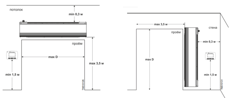 Принцип действия завесы основан на защите смесительного типа, т.е. эффективном смешивании втекающего наружного холодного воздуха с нагретыми струями завесы в пределах тамбура или вестибюля. Устанавливается внутри помещения, горизонтально над проемом или вертикально, сбоку от него, как можно ближе к краю. При большой ширине проема можно располагать сразу несколько завес вплотную друг к другу и управлять ими с одного пульта. Подходит для установки в складских помещениях, гостиницах, ресторанах, супермаркетах и др.