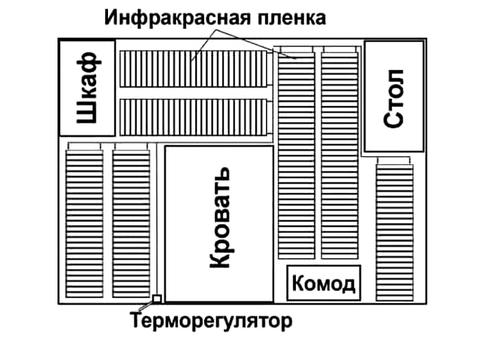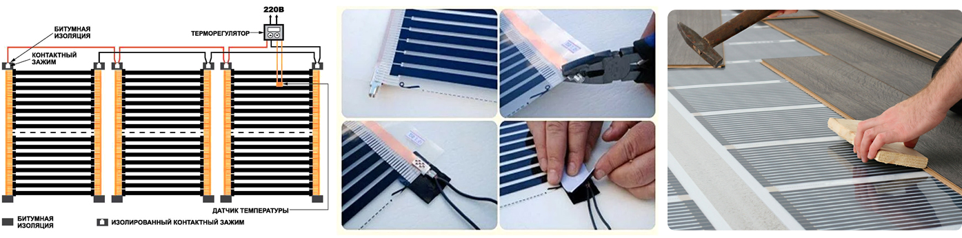 Готовый комплект инфракрасного пленочного теплого пола с механическим терморегулятором — это простое и экономичное решение по организации комфортного подогрева пола в помещении. Пленка монтируется сухим способом, не требует стяжки, и подходит даже для законченного ремонта. Толщина полотна всего около 0,4 мм и укладывать его можно под ламинат, линолеум, ковролин, паркетную доску.