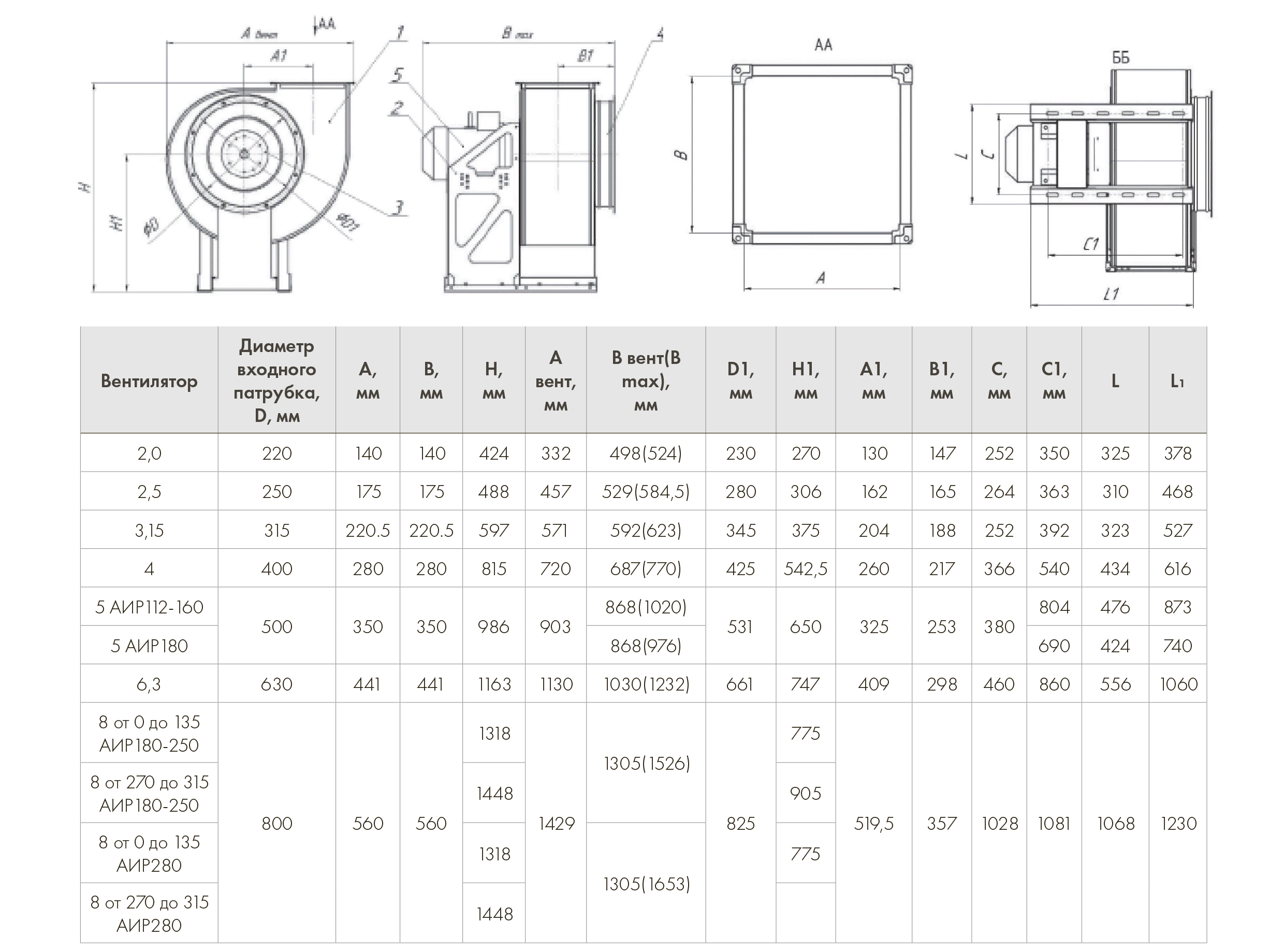 Габаритные и присоединительные размеры радиальных вентиляторов ВР 280-46: